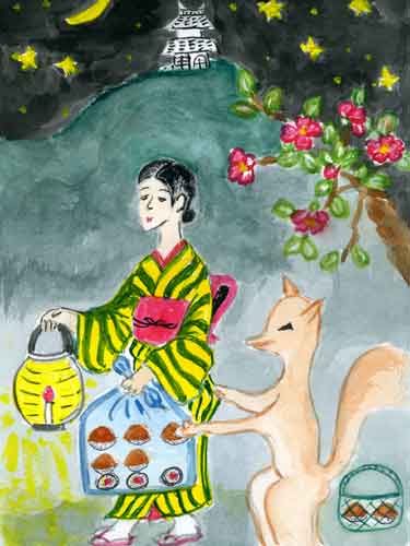 ある娘さんが、祭りやめでたい日に、巻ずしや稲荷ずしなどを重箱に入れて、運んでいました。