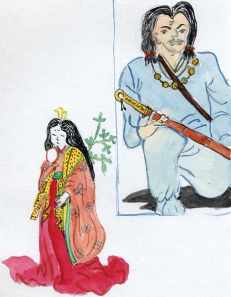 ある時、弟・山幸彦は、兄・海幸彦の猟具で魚釣りに出ましたが、釣針を失い、探し求めて海宮(龍宮)に赴き、海神の娘・豊玉姫と出会い結婚しました。