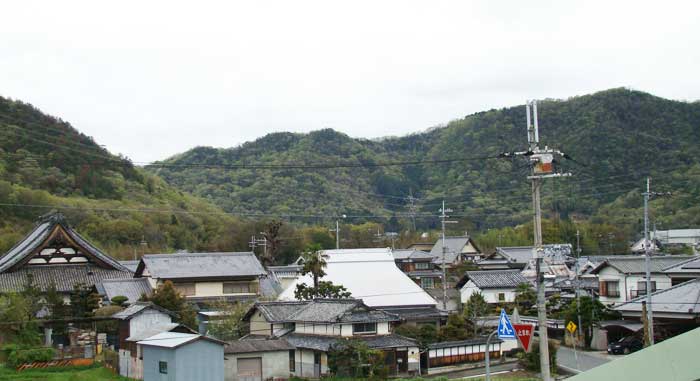 左側のお寺と右側の道路と背後の山の形はほぼ同じに再現されました。