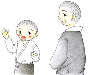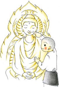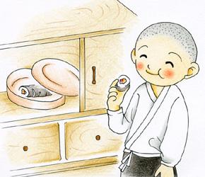 | 晩に和尚が帰ってきて、すしを食おうとすると、一つもない。 「小僧、お前知らんか」 というと、 「なんにも私は知りませんが、さっきに本堂のお仏壇の方で、ムシャムシャ音がしよったように思います。阿弥陀はんでも、食うたったんじゃありまへんだあっか」 という。和尚が仏壇をあけてみると、なるほど、阿弥陀如来の口のはたに、すしの飯粒が少しついている。 |
