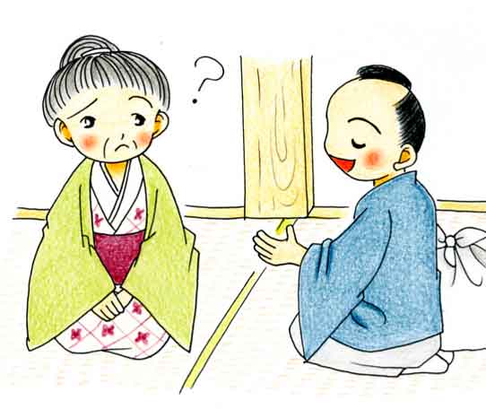 | 座敷(ざしき)へ通ると、先ずその家のお婆さんが挨拶に出た。婿は、ここじゃと思うて、 「此(こ)のばばは、南京ばばか、京婆か、さては唐から渡り婆か」 というた。 |