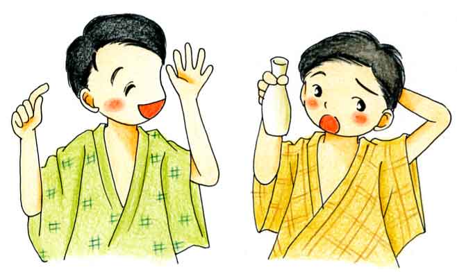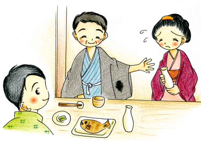 | 昔むかし、ある村で新年宴会(えんかい)が例によって開かれた。 酒もよくまわり、にぎやかなことになった。 ある人が酒の酌(しゃく)をし、つい、大金持の旦那(だんな)さんの着物を汚(よご)し、お断りしたら、旦那はんは、「こんな着物はなんぼでもある。かまわないよ」 といった。 同じ場で飲んでいた一人の男は、なんでもあのようにほめてもらいたいと思っていた。 |