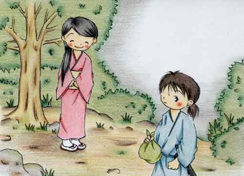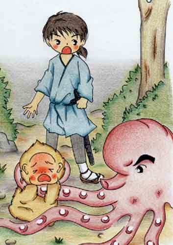 旅の男が、日の暮れに坂を越しよった。七分目ほど登った所に、一匹の猿が、大きな蛸(たこ)にしめられて死にそうになっている。男は刀をぬいて、蛸の足を切って、猿を助けてやった。猿は喜んで、お礼に小さい風呂敷包みを一つくれた。
