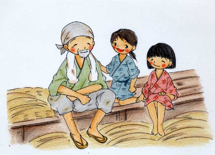 | 「よしよし、話はいくらでもある。してやるが、前にこの藁打ちを手伝ってくれたら」 といい、子供はよろこんで手伝った。子供たちは、 「さあ話をしてくれ」 という。おじいさんは、 「私の口を見よ」 といって口をあけた。子供たちはその口の中を見ると、歯が一つもなかった。おじいさんは、それで、 「歯無(はな)し」 といったそうです。 |