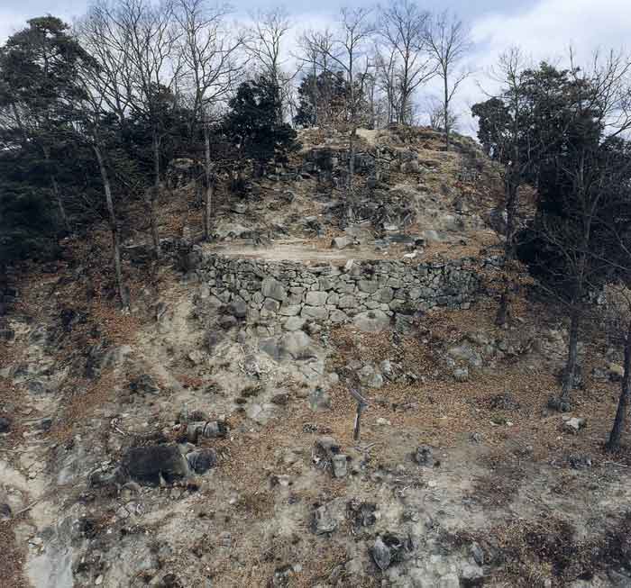 | 感状山の山頂部を中心とし、南へのびる稜線上(馬背上の上部)の遺構で、近世城郭でいう本丸(T曲輪)と二の丸(U曲輪)にあたります。 海抜301.05メートルの山頂部平場がI曲輪で、東西21メートル、南北27メートルのひろさ、東と南側に約2メートル低く帯曲輪がめぐっています。 石垣は内側斜面が保存状況が良好で、自然岩盤もふくめて巨石が積まれています。曲輪内には、礎石および建物壁面遺構とみられる列石状遺構があり、虎口は西南側に坂をともなっています。 I曲輪北西側に三ないし四段階から北曲輪群が存在し、西南斜面に井戸(円形石組)があります。 |