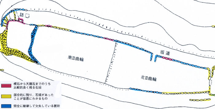 | 全体的に欠失している箇所が多い。しかし、この曲輪は根石部分が残っているので、概ね旧状の把握が安易である。城道との境に部分的(3カ所)に完全な形で残っている。この部分は、他が痕跡をとどめないほど欠落しているのに、当初の工法をそのまま伝えている。不自然な破損の仕方である。この部分は比較的小さい石が用いられていたので、人為的に抜き去られた可能性もあろう。南U曲輪の南下にある張り出しは、南西隅の詰口の辺りが良く残っている。 角石に大きな石が用いられ、堅固な石積みが幸いしている。番所の痕跡と門柱礎石も良く残る。しかし、城道との境に残る石垣は大きく孕み出し、このままでは直ち崩壊しよう。樹木が伐採されたため、雨水が石垣の裏に流入し、土圧で前面に押し出されたことが考えられる。遺構を永く後世に伝えるためには、樹木と雨水の対策は万全を期したい。 |