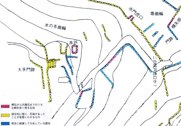 | (2)石垣の現状 F大手門跡、水の手曲輪 大手門跡といわれる虎口は、幅が2.9mもあり、高低差1.8mを9段内外の石段で登ったと思われる。登り切った位置に門を構えていた。門を過ぎると城道はすぐに右折し、10mほどで左折して、二の城戸に向かったと思われる。虎口には、東西に築かれた高さ2.3mの石垣に沿って進入したと考えられ、一種の馬出しの構えである。石の面に加工痕があり、石使いの工夫もあることから、ある程度発達した過程の虎口であったと思われる。この東西に延びた石垣は、余り高くないので、櫓はなく、単なる門構えだけであったと思われる。 大手門のやや北に大小の曲輪があった。小曲輪の石垣は、東と南の切岸側に築かれている。大曲輪はこの小曲輪を包み込むように囲い込んで、石垣が積まれている。この虎口は城道に画していたと思われるが、場所は定かでない。大曲輪を過ぎると、城道は東北に折れ、二の城戸に向かう。この南西から東南の城道の東南切岸にも、低い石垣があった。 水の手曲輪の谷にも土留的なもの、あるいは井戸に行く城の石垣があったが、ここも詳細は明白でない。 現況の地表観察では、これ以上の詳細は不明である。 |