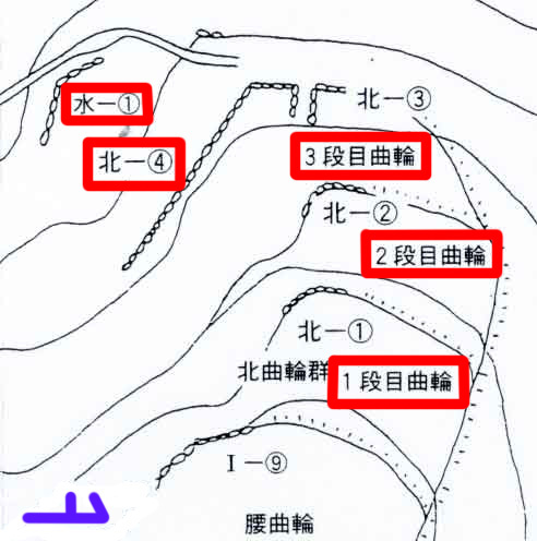 | (3)破損状況 北曲輪群 地表観察により図表24のように石垣の位置を想定したが、判断の難しい場所である。部分的に残った以外は、根石さえない。3段目曲輪の南端に大きな石が用いられている。角を意識して積んだものと考えられる。城道が明確でなく縄張りが特定できないので図表24に示した以外にあったのかもしれない。縄張り調査の成果が待たれる。 |
