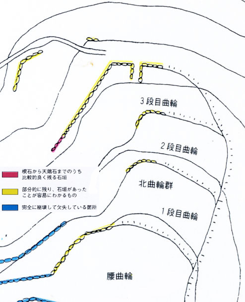 | (2)石垣の現状 G北曲輪群 東から西に延びた尾根を3段に削って造った曲輪と、谷を数段に削平した曲輪から成り、合計10カ所以上の小曲輪があったはずである。石垣は多く築かれていない。1段目と2段目の曲輪は、それぞれ南西隅にあるだけである。3段目曲輪は等高線に沿って、高さ1.6〜2.0mで延40.5mが築かれていた。V曲輪の西に 幅1.6mの虎口が確認できる。ここから、I曲輪に至る城道があったと思われるが、詳細は不明である。地表観察からは、1段目、2段目曲輪へのルートは、T曲輪を囲む腰曲輪の辺りから下がっていたと思われる。詳細な調査を行えば、この下方の曲輪部分を含めた縄張りが明白になろう。 |