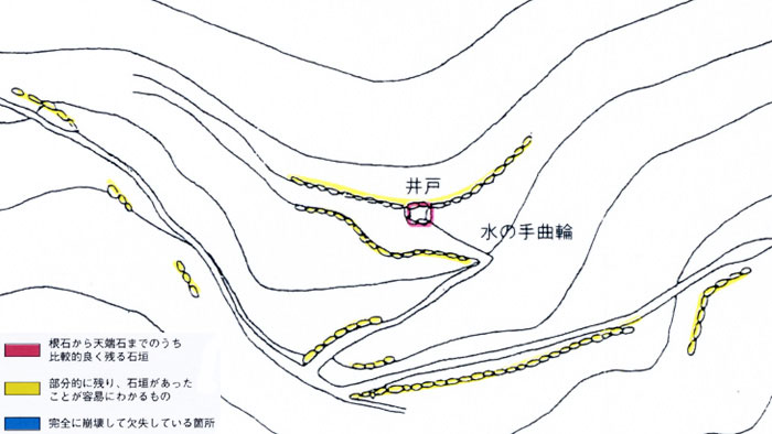 | (3)破損状況 搦手・水の手曲輪 もともと低い石垣であり、遺構は比較的良く残っている。史跡公園として道路が整備されれば、今後の保存を憂慮することもなかろう。 |