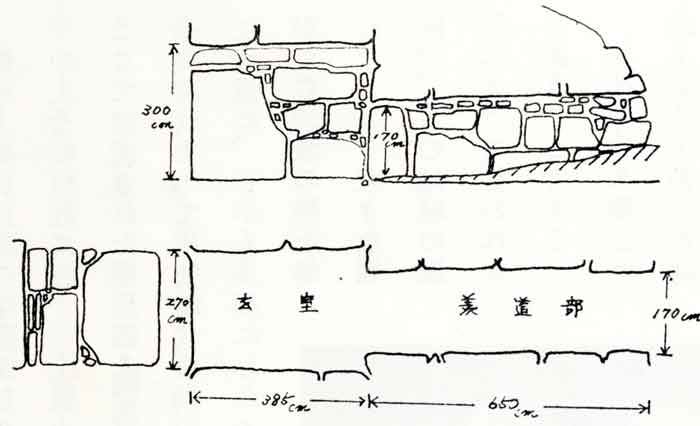 南に口をひらく横穴式石室は、全長が10.6メートルあります。入口(羨門)の部分の石が抜き取られた形跡があるので、もとの長さは、さらにそれをいくらか上まわるでしょう。玄室は長さ3.9メートル、幅2.8メートルで、六畳敷きほどのひろさがあります。床から天井までの高さは3.3メートルあります。