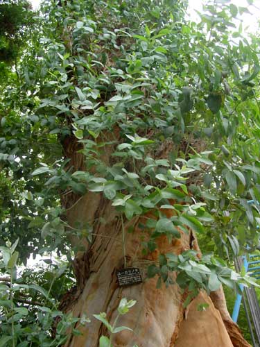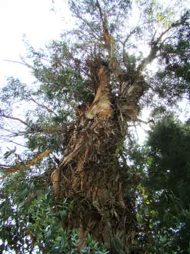 ユーカリノキは、フトモモ科の常緑高木で、樹高約20m、株元周5.4m、推定樹齢約110年で、コアラの食料としても知られ、主に、オーストラリア南東端部とタスマニア島に分布しています。成長が早いので世界各地で造林用に用いられ、公園などに広く植えられています。ユーカリノキは明治になってから、日本に輸入されはじめ、このユーカリノキは、大正初めに相生港近くの木材商の木材置き場にあったものを、その後、相生小学校の校庭に移されたものです。腐敗部もありますが木の勢いは盛んで、その大きさから県内でもトップクラスの巨木です。
