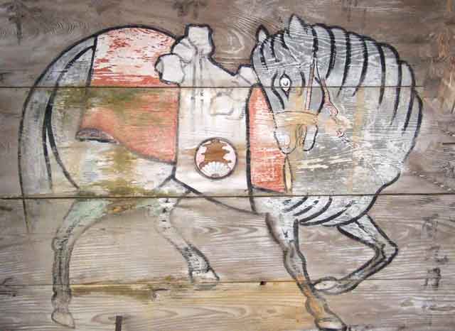 に宇麻志神社の拝殿に奉納されたものです。市内には各神社に多くの絵馬が掛けられていますが、この絵馬は、図柄などの保存が良好なもののなかでは最も古いものです。