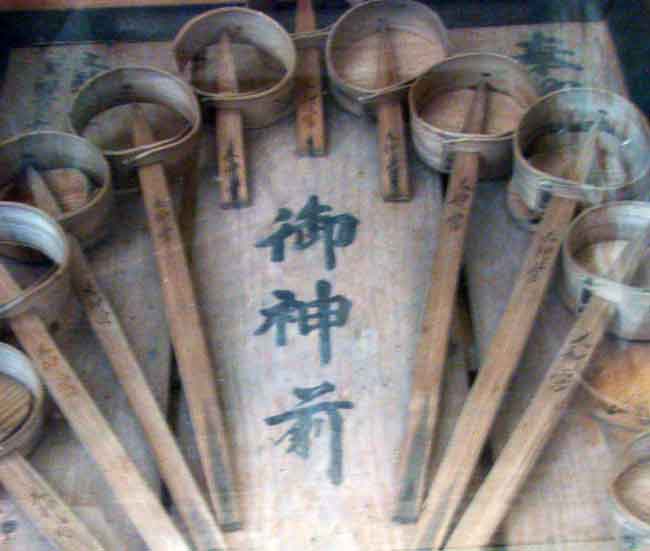 金峯神社の拝殿に奉納されています。おかげ参りは、江戸時代に流行した伊勢神宮への群集参拝をいい、文政13年(1830年)に参宮した記念として、「おかげ参り柄杓」12本を額に打ち付けて、鎮守社に奉納したものです。