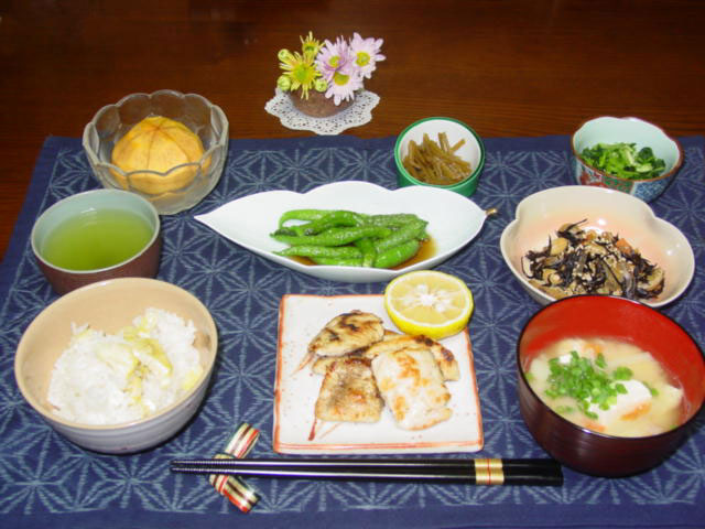 | (03)11月「栗ご飯」 知人からシシトウのもぎたてをいただきました。「季節的に少し硬くなっているので、素揚げにして麺つゆをかけると美味しいですよ」と、教えてもらったのでその通りにしてみました。なんと、ベリーグッドでした。夏の残りの「麺つゆ」がこんな所で役にたちました。 ご飯は、栗ご飯です。栗がたくさん手に入った時に鬼皮を取って、渋皮も剥いて冷凍保存しています。それを数個ずつ ご飯を炊くときに入れて秋の季節を楽しんでいます。 みぶなは3%の塩をして漬物容器で数時間漬けておくと簡単に出来ます。これからが美味しい漬物です。 ひじき煮は中に大豆・こんにゃく・人参・薄あげ・ごまを入れて、私の大好きな常備菜です。 鶏むね肉は削ぎ切りにしてフライパンで焼いたものに、柚子をかけて食べます。柚子の酸味があっさりと爽やかで美味しいです。 | |