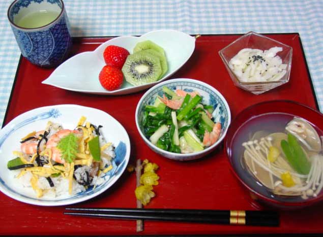 ばら寿司 蛤のお吸い物 わけぎのぬた 大根の即席漬 キウイ・いちご |