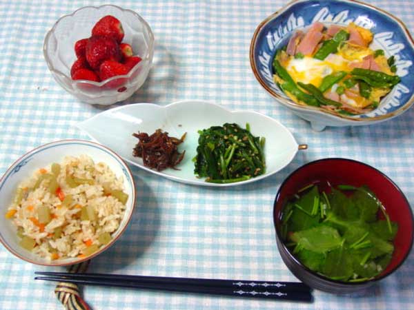 絹さやの卵とじ ホウレン草ゴマ和え 釘煮 蕗ご飯 三つ葉お吸い物 いちご | |