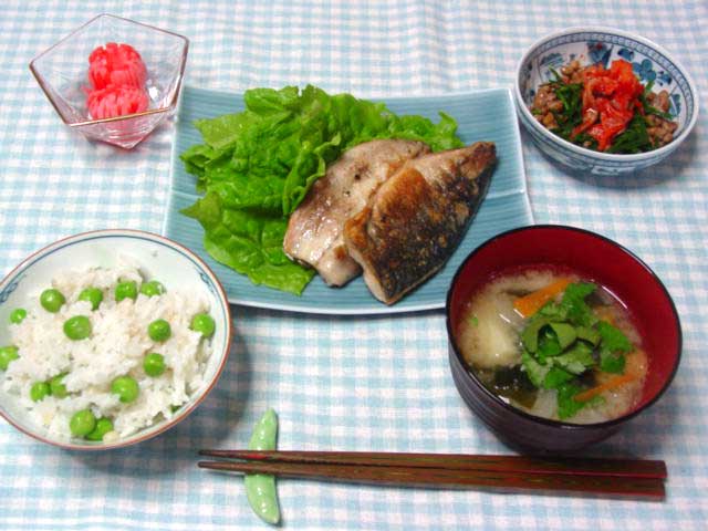 | 6月は初夏ということで、色々な食材が元気です。 鯵は1年中ありますが今が旬だというので、シンプルにソテーにしました。たっぷりのサラダ菜を添えて。 今年初めて姉に教えてもらって、プランターに「二十日大根」を植えてみました。種を蒔くと名前の通り20日程で1〜2cmの丸くて赤い可愛らしい大根が出来ました。菊の花に切り甘酢漬けを作ってみました。外の赤が中までピンクになり可愛いです。 同じくプランターにニラも植えてみました。この暑さと雨でグングン伸びて収穫できます。それをサッと茹でてダッパに保存しています。キムチと一緒に納豆に入れると、何だか元気が出るような気がします。 味噌汁は新玉ねぎ・じゃが芋・人参・ワカメ・三つ葉等、具だくさんの味噌汁です。 グリンピースも採れたてを近所からいただきました。まずは「豆ご飯」で初夏を感じました。 | ||