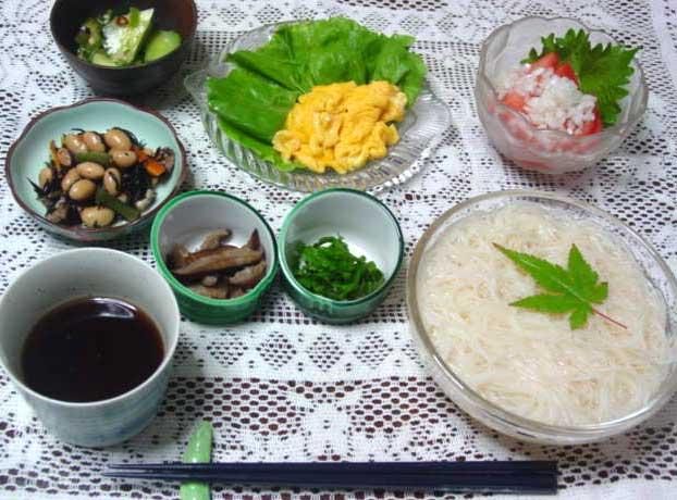 そうめん (青じそ・椎茸甘煮) スクランブルエッグ トマトサラダ ひじき煮 キュウリの醤油漬け | |