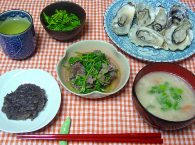 おはぎ かきの酒蒸し 菜の花煮浸し 牛肉と三つ葉煮物 かす汁 | |