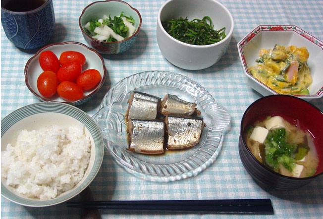 秋刀魚の甘露煮 なんきんサラダ 人参葉のゴマ和え 大根即席漬け 味噌汁 プチトマト 麦入りご飯 | |