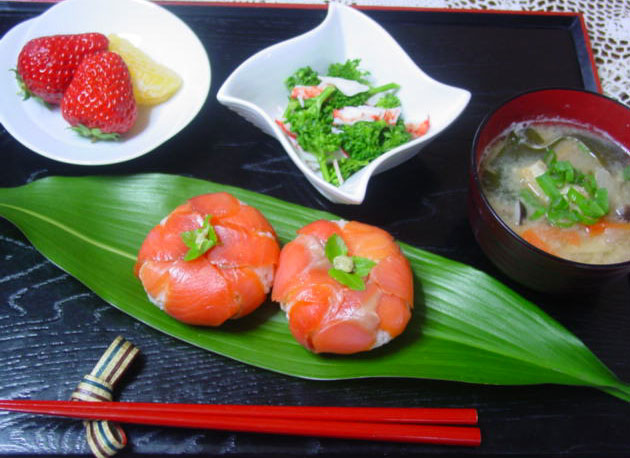 | 庭に小さな菜園を始めてから半年になります。何をしても分からない事ばかり。 ほうれん草やブロッコリーがグングン大きくなって喜んでいたのですが、ふと気がつくと小鳥達の餌場の状態です。 ブロッコリーの葉はレースの様、ほうれん草は葉は食べられて中央の芯だけ残っていました。 「よく、ここまでほおって置いたね。網をかけなさい。」とアドバイスを貰ってあわてて網をかけました。 畑作りもなかなか難しいです。 3月になると お雛様を飾って心も華やぐので、「スモークサーモンの手まり寿司」を作ってみました。1合のすし飯で4個作りました。ラップに包んで作るので、そのままの状態で翌日も大丈夫です。 ブロッコリーが良く採れるので、毎日のように食べます。 味噌汁は具がたっぷりです。じゃが芋・玉ねぎ・人参・豆腐・アゲ・ワカメ・ねぎ等、冷蔵庫にあるものをどっさり入れます。 | |||