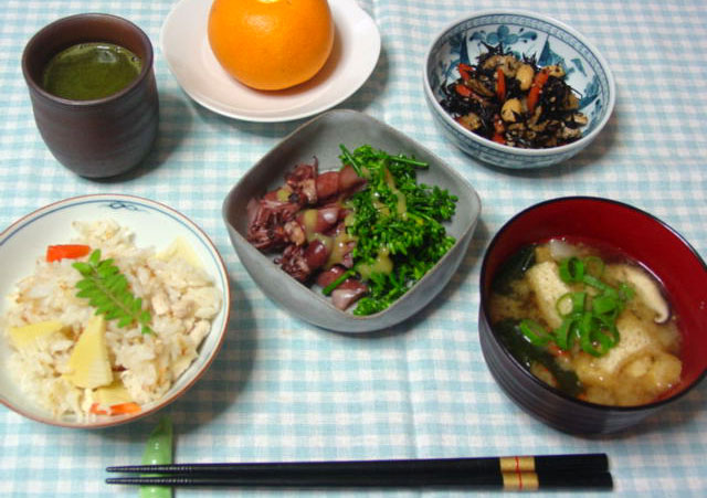 | 暖かくなって久しぶりに庭に出てよーく見てみると、木々や草花が芽吹いていました。 山椒も新芽を出していました。そこへ運よくたけのこを頂いたので、今年初の「たけのこご飯」です。薄揚げ・人参・鶏肉も入れます。炊き上がったら混ぜて、山椒の葉を乗せると良い香りで春の到来を感じます。 旬のホタルイカと庭のブロッコリーの茹でたのを辛子酢味噌でいただきます。 常備菜のひじき煮。これまた茹大豆・人参・揚げ・椎茸と、色々な物を入れています。 味噌汁は具がたっぷりです。椎茸・人参・アゲ・ワカメ・ねぎ等、冷蔵庫にあるものを入れます。 | |||