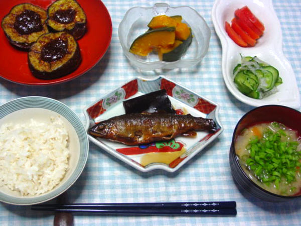鮎の甘露煮 茄子のステーキ なんきん煮 きゅうり・糸寒天甘酢和え トマト 味噌汁 麦入りご飯 | |