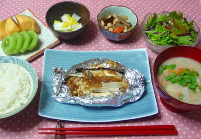 茸のホイル焼き (鶏肉・エノキ・エリンギ) 粕汁 水菜サラダ 柚子大根 五目豆 柿・キウイ ご飯 | |