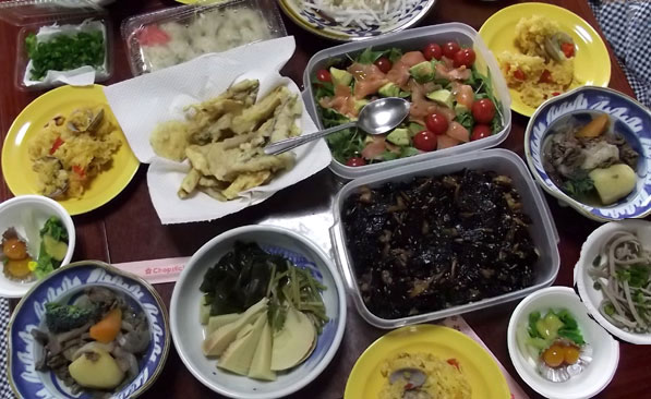 パエリア 若竹煮 海藻煮 手打ちそば 大根の貝柱(缶詰)のせ ウド・筍の天ぷら サーモン・アボガド・ トマト野菜サラダ 炊き込みご飯 金柑甘露煮・ ウド味噌のせ |