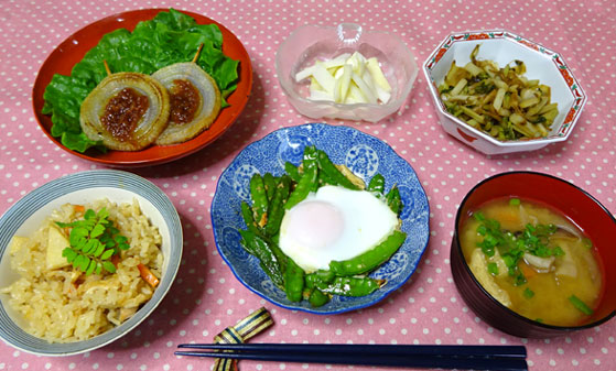 筍ごはん たまねぎステーキ うど 甘酢あえ うどのきんぴら エンドウの卵とじ 味噌汁 | |