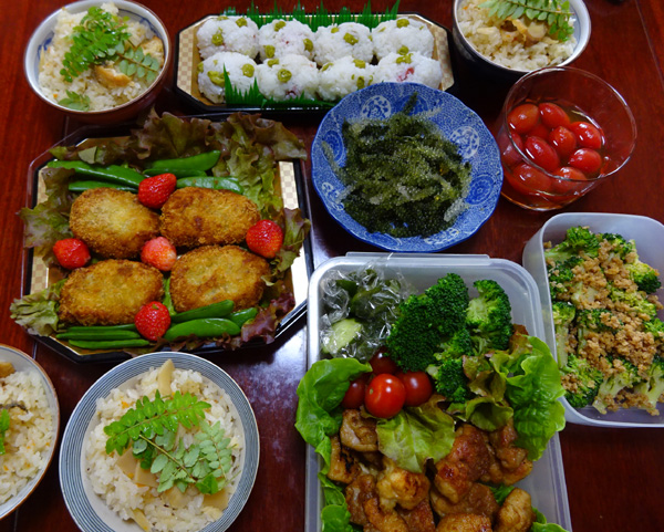 | この春から近所の人達とも 持ち寄りお喋り会をしています。このグループ(ワイワイ女子会)では2回目です。 私は鞆の浦に行ってきたので「鯛めし」を出しました。すると5月に一度は食べたい「豆ご飯」も来ました。ご飯が重なりましたが、残ったのはそれぞれ持って帰って夜のご馳走です。 私一人の食事では揚げ物を殆どしないので、久しぶりの手作りコロッケを味わう事が出来ました。 今回、鶏肉ソテーの 簡単だけど美味しい作り方を教えてもらいました。また、ブロッコリーをくるみで和えると普通の塩茹でとは随分違ってワンランク上の味で、感心しながらいただきました。 プチトマト甘酢漬けはトマトを湯むきして皮を取り、甘酢に漬けておくというものです。あっさりして美味しいので 我が家の菜園でプチトマトが収穫できたら是非作ってみようと思っています。 海ぶどうは沖縄のおみやげです。皆で「珍しい!」と言いながら食べました。 持ち寄り会は、それぞれの家の何気ない毎日の料理を教えあう機会になりました。結果、マンネリになりがちな日常に刺激を与える事にもなりました。お互いに「いい事を始めたね!」と言い合っています。前向きのお喋りが出来るというのは大切で、ボケ防止にもなるそうです! 何より嬉しいのは、気を遣わなくても素のままで心を通わせる人がいるという幸せを 食べながら感じられます。 家事評論家の吉沢久子さん(98歳?)の本を読んでいる時に、こんな言葉がありました。そのグループを大切にするには 『お互い私生活に踏み込み過ぎない事が よい人間関係を保つために必要である』と。その通りで その様な事にも心して 長くお付き合いをお願いしたいと思っています。 | ||