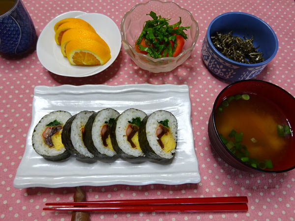巻き寿司 トマトサラダ チリメン佃煮 味噌汁 オレンジ | ||||