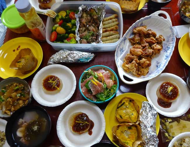 鶏のから揚げ 鶏のハーブ焼き ふろふき大根(柚子味噌かけ) 南京グラタン ブロッコリー茹・トマト 生野菜の生ハムのせ ハーブウインナー マーボー大根 小芋とイカの吸い物 ひじきご飯 焼き芋 | |