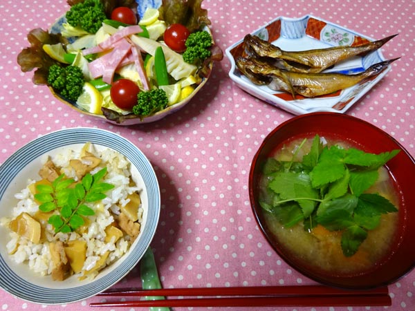 筍ご飯 春野菜サラダ 魚の干物 味噌汁 | ||