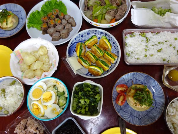 肉じゃが ごぼうの牛肉巻き 人参・インゲン巻き 竹輪ときゅうり・レモン ポテトサラダ グリンピースの天ぷら たまねぎステーキ チンゲンサイ漬物 昆布佃煮 梅ゼリー 赤飯・豆ご飯 後でケーキ・コーヒー | ||