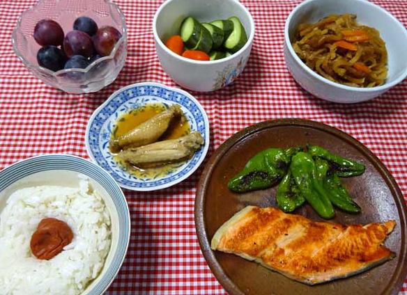 秋鮭・ピーマン焼き 切干大根煮 手羽中煮 キュウリ漬物 ブドウ 梅干ご飯 | ||