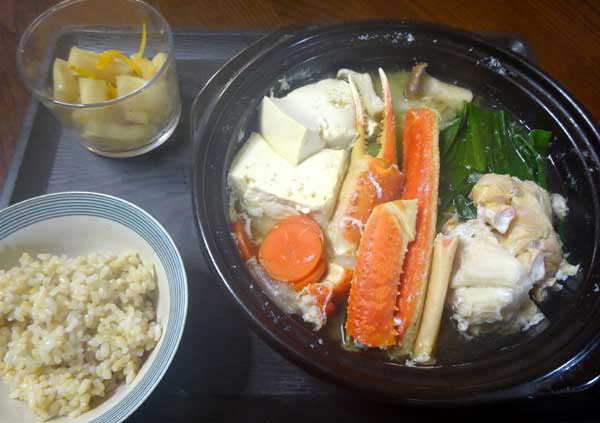 (90)2月「カニ鍋」 カニ鍋 大根柚子漬 玄米ご飯 かに 夫が生きていた頃は、毎年冬になるとカニを日本海の香住から取り寄せていました。冷凍で来るので、出刃包丁で食べやすい大きさに切るのは私の役目でした。 夫が居なくなってからは、自分のために取り寄せる事はありませんでした。 ところが、先日近所の親しくしている人からカニを頂きました。久しぶりに出刃包丁で切りました。 嬉しいやら 夫を想い出し 懐かしいやらで 涙がこぼれそうでした。 心がほっこりする カニ鍋でした。