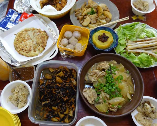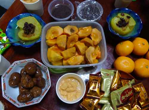 (112)12月「 持ち寄り会」 長芋と鶏肉炒め煮 ひじき煮 タコ巻きレタス添え 小芋煮 お好み焼き 冬瓜と豚肉煮 ひじきおこわ 柿スムージー 焼きリンゴ 水羊羹 栗渋皮煮 柿スムージー チョコレート菓子 みかん 柿 コーヒー、日本茶 今年最後の持ち寄り会でした。気の置けない人たちと時間を気にせずにお喋り出来るのは幸せを感じます。 次回会う時までにどんな事を頑張ったか言えるようにしておかなくては・・・。 次は何を作ろうか?と考えるのもボケ防止になるかな?と、前向きにとらえています。