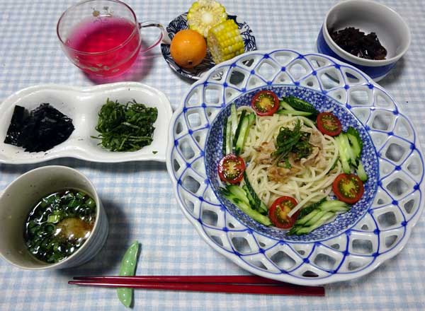 (119)7月「そうめん」 そうめん きゅうり・トマト トウモロコシ茹で フキ佃煮 琵琶 シソジュース 我が家の1坪菜園のシソです。こぼれ種で所狭しと生えています。 今年はもう2回ジュースを作りました。上のピンク色のジュースがそうです。クエン酸を入れてるので、疲れが取れます。夏は専らシソジュースです。 もう、1〜2回出来そうです。