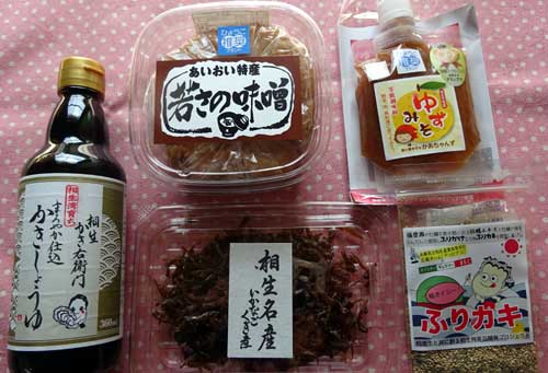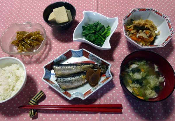 (127)3月「茎ワカメ佃煮」 鰯煮 茎ワカメ佃煮 切り干し大根煮 お浸し 高野豆腐煮 味噌汁 麦入りご飯 「相生健幸マイレージ」に当選 相生市での市民の健康促進のための取り組みです。 各自が 食べ物や運動など目標を立てて実行し、1年間記録します。 それを市に「相生健幸マイレージ」として応募すると、相生の特産品が貰えます。 今回、初めて当選しました。美味しいものばかりで嬉しい!