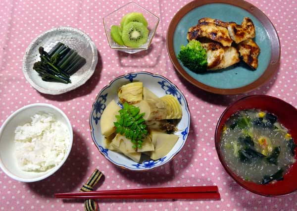 (129)5月「筍煮 」 鶏肉照り焼き 筍土佐煮 わらびお浸し 春雨スープ 麦入りご飯 キウイ 筍やわらび、まさに春です! 圭介祭り 無事おわりました 強風で色々なものが吹き飛ばされる中、マジックを やり終える事が出来ました。 何より嬉しかったのが 友達が応援団で来てくれて、大いに盛り上げてくれました。これ程、心強いことはありません。皆さんありがとうございました!