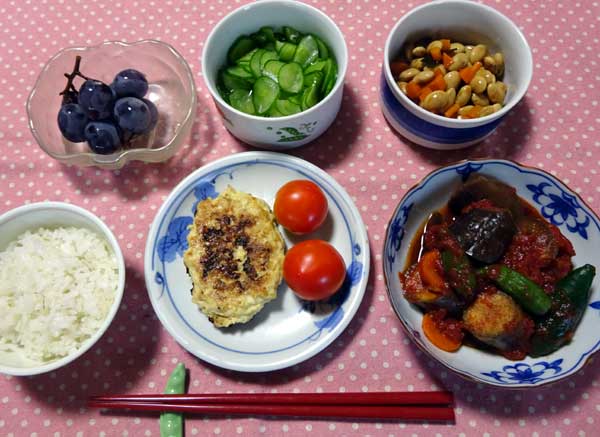 (133)9月「なすのトマト煮 」 ハンバーグ なすのトマト煮 大豆の五目煮 きゅうり揉み ぶどう 白米 なすやキュウリが美味しいです。キュウリはあっさりと酢の物に。なすは肉巻きにしてガッツリ食べたり、厚めに切って、フライパンで焼き上に柚味噌をかけてステーキにしたりと、幅広く楽しめます。今日はトマト煮にしました。