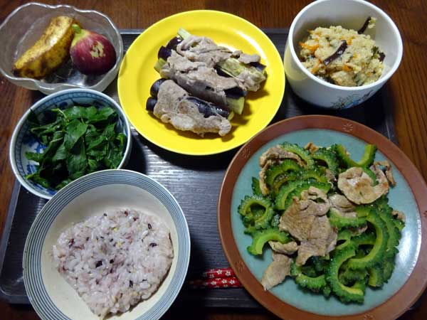 (134)10月「ゴーヤチャンプルー 」 ゴーヤチャンプルー なすの肉巻き モロヘイヤお浸し おから イチジク・バナナ 15穀米 今年は異常気象で、10月の初めまで真夏のような暑さが続いていました。その影響で作物の収穫に影響があったようです。 我が家も庭の柿が全部 実が成りかけぐらいで、落ちてしまい全滅です。あ〜あ
