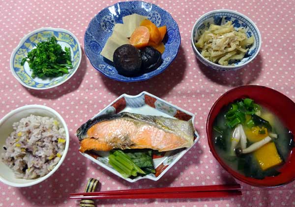 鮭焼き、小松菜