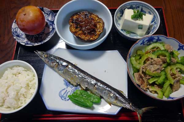 ナス肉みそ乗せ・秋刀魚焼き・ゴーヤチャンプルー・冷ややっこ・柿・ご飯