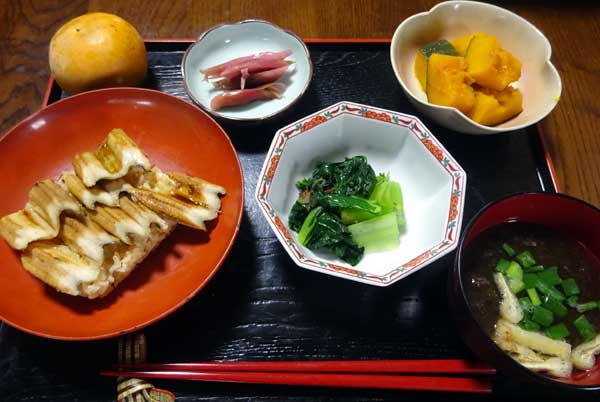 | アナゴご飯・南京煮物・おひたし・みようがピクルス・わかめスープ・みかん | ||