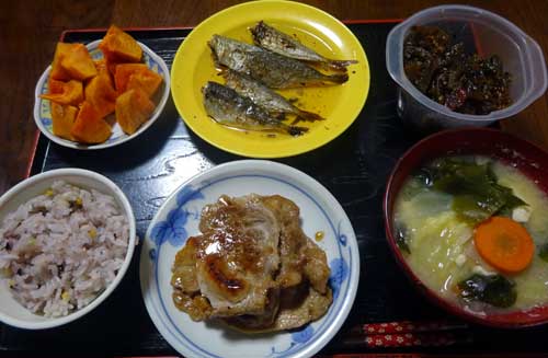 豚の生姜焼 鯵の南蛮漬け きゅうりの漬物 味噌汁 15穀米 柿