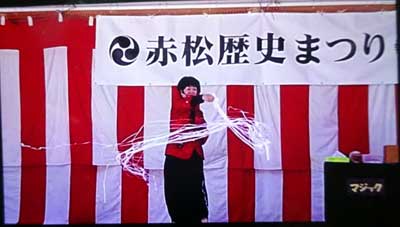 これは、紙を細く割いてうどんを作っている所です。歌舞伎でも使うものです。華やかで喜ばれます。本物のうどんが出てきて実際に食べるので驚かれます。