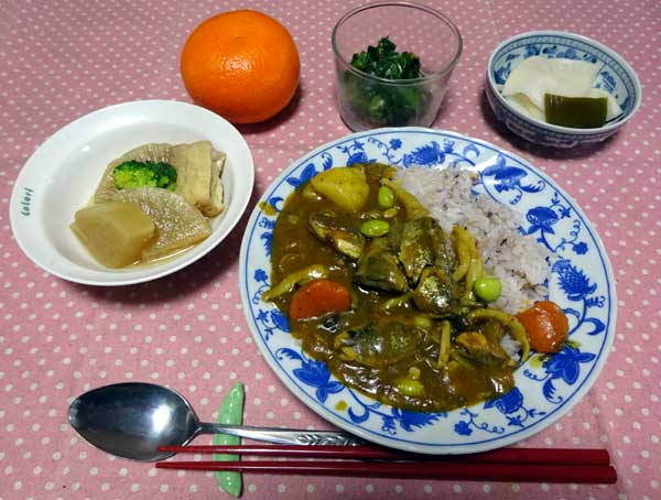 | 鯖缶カレー・蕪の千枚漬け・大根葉炒め・大根煮・みかん | ||